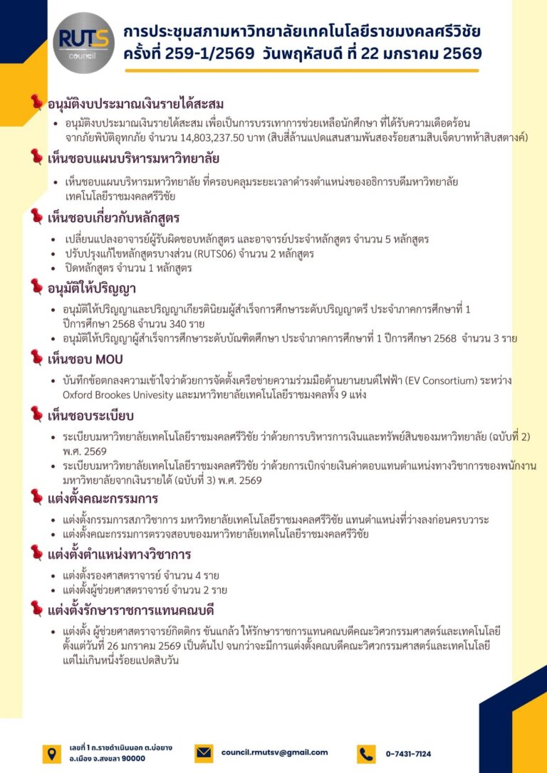 สรุปมติสภามหาวิทยาลัย สรุปมติที่ประชุมสภามหาวิทยาลัยฯ ครั้งที่ 259-1/256923 มกราคม 202623 มกราคม 2026